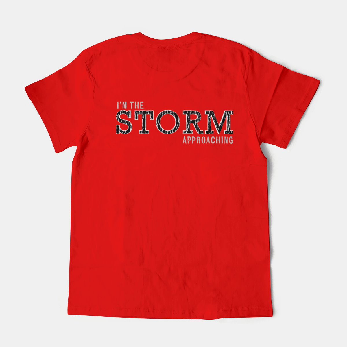 A shirt that reads 'I'm the storm approaching' with thunder strikes across the word 'storm'.